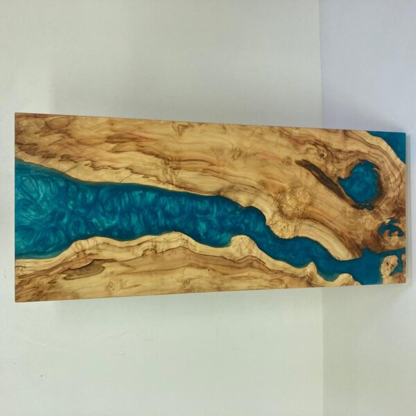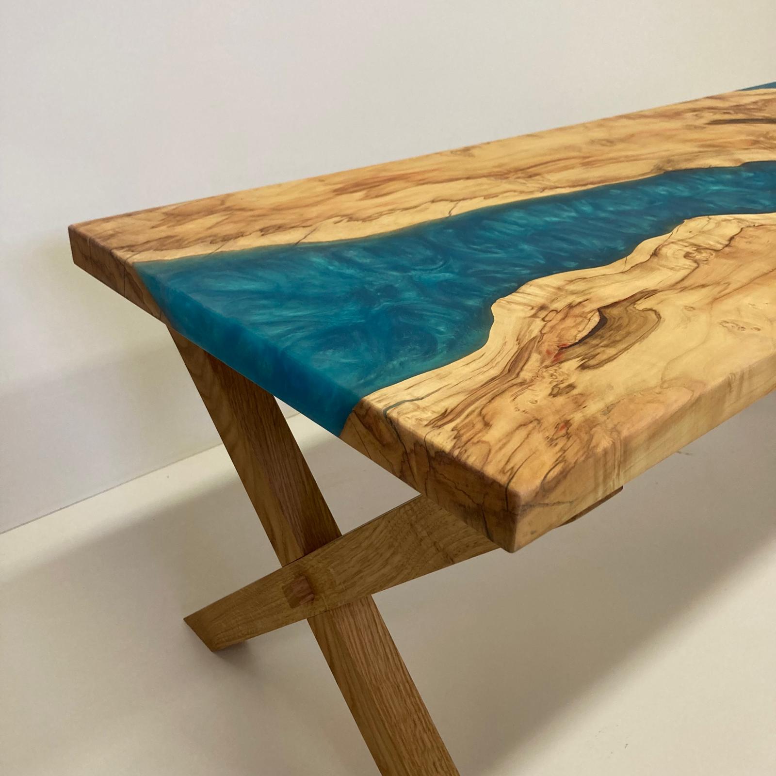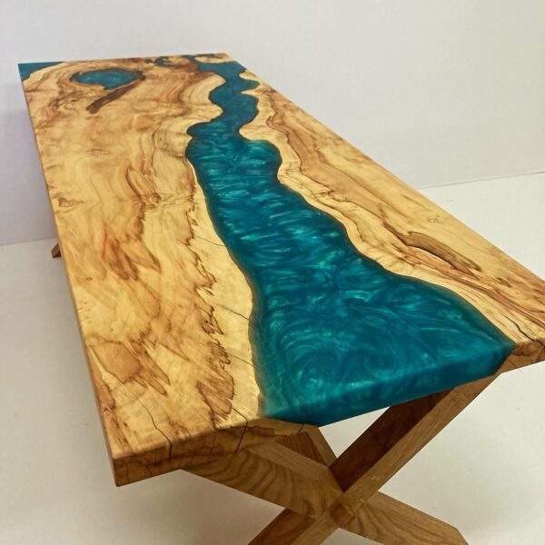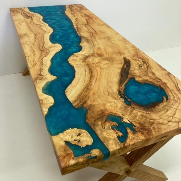 Tento konferenční stolek je jedinečným spojením přírodních materiálů a moderního designu. Deska stolu je vyrobena z očkového topolu, jehož charakteristická kresba dřeva je zvýrazněna modrou epoxidovou pryskyřicí, která vyplňuje přirozené dutiny a praskliny, čímž vytváří působivý vizuální efekt připomínající tekoucí vodu nebo hluboké moře. Podnoží stolu je z masivního dubu, což zajišťuje stabilitu a dlouhou životnost nábytku.