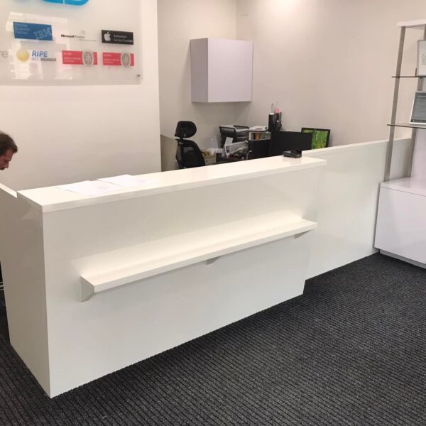 Tento moderní obchodní pult je navržen s důrazem na funkčnost a elegantní vzhled. Je vyroben z dřevotřískových desek potažených lesklým bílým laminátem, což mu dodává čistý a profesionální vzhled, zároveň zajišťuje snadnou údržbu a odolnost proti opotřebení.