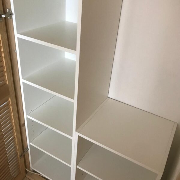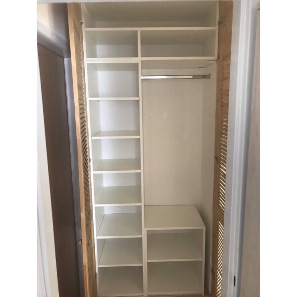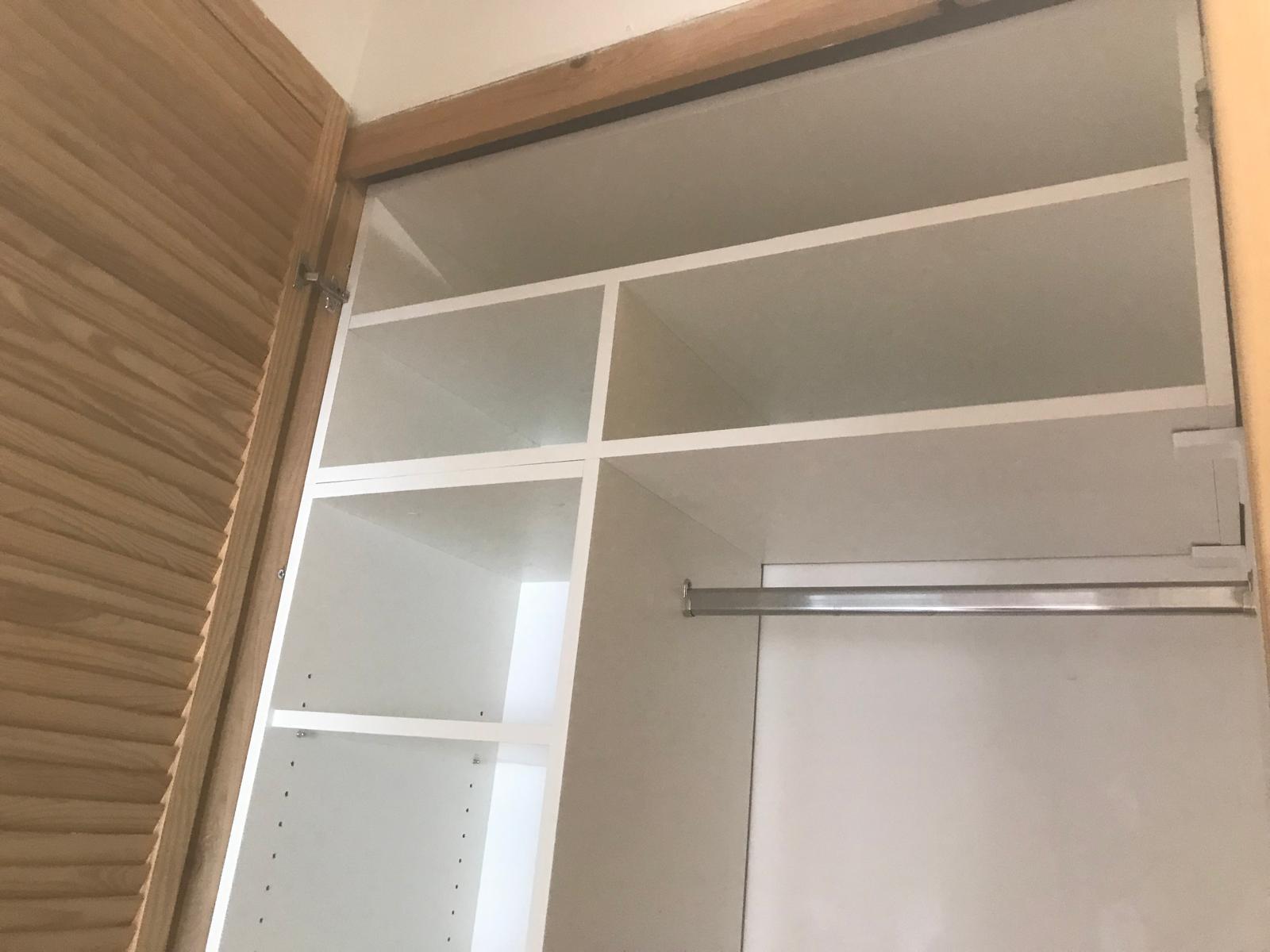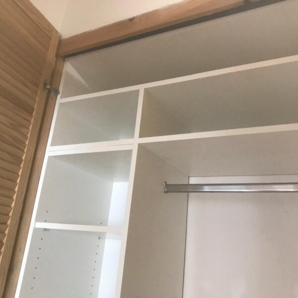 Do již existujícího výklenku s dveřmi jsme navrhli a vyrobili praktický úložný prostor. Korpus skříně byl přesně přizpůsoben tvaru prostoru a skvěle zapadl. Skříň je kombinací polic a šatní tyče, ideální pro uskladnění sezónních věcí, jako jsou bundy a kabáty.