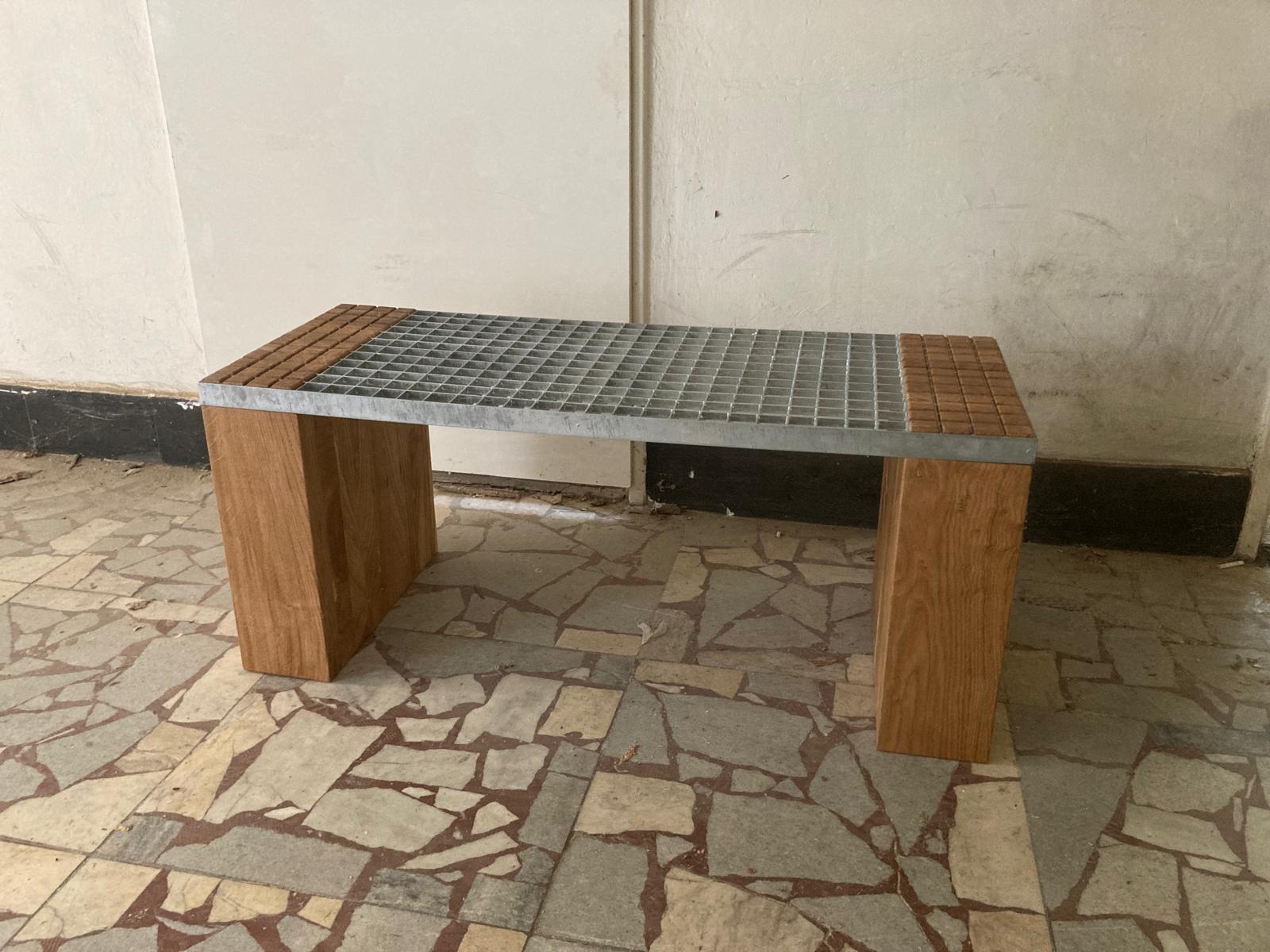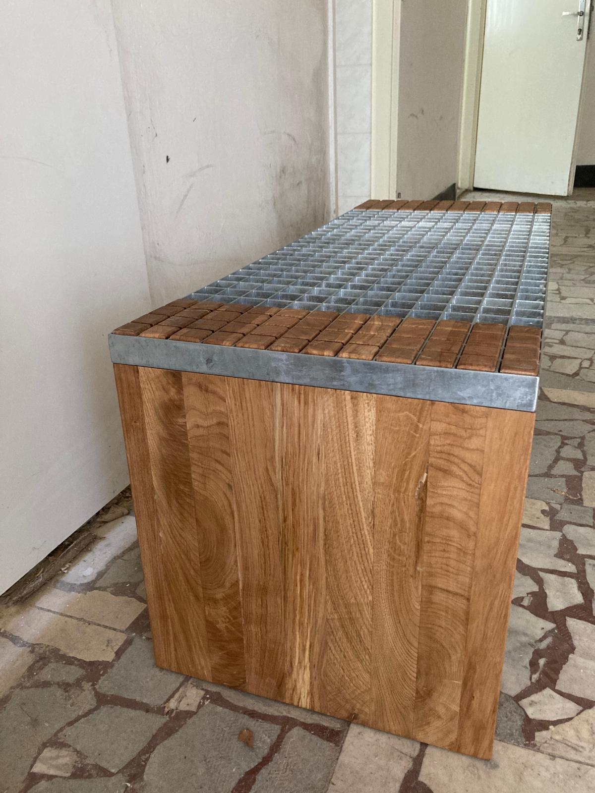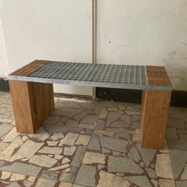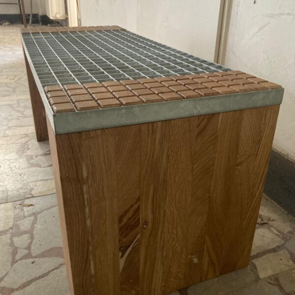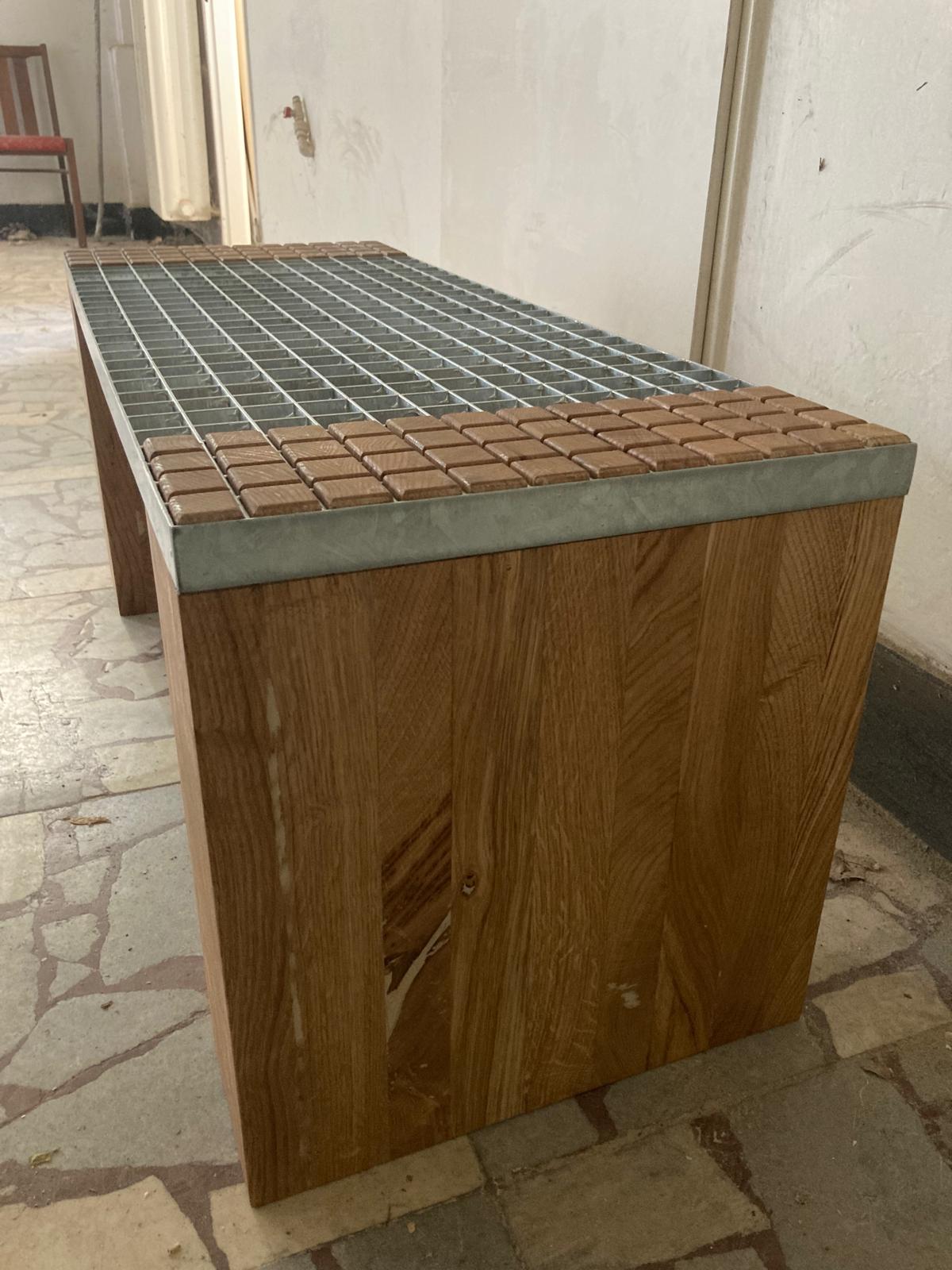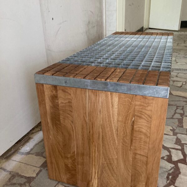 Tato lavice je sestavena z pochozího pozinkovaného roštu a precizně vyřezaných dubových kvádrů, které přesně zapadají do jednotlivých čtverců roštu. Povrch je ošetřen bezbarvým matným tvrdovoskovým olejem OSMO, který zvýrazňuje přirozenou strukturu dřeva a zajišťuje jeho ochranu.