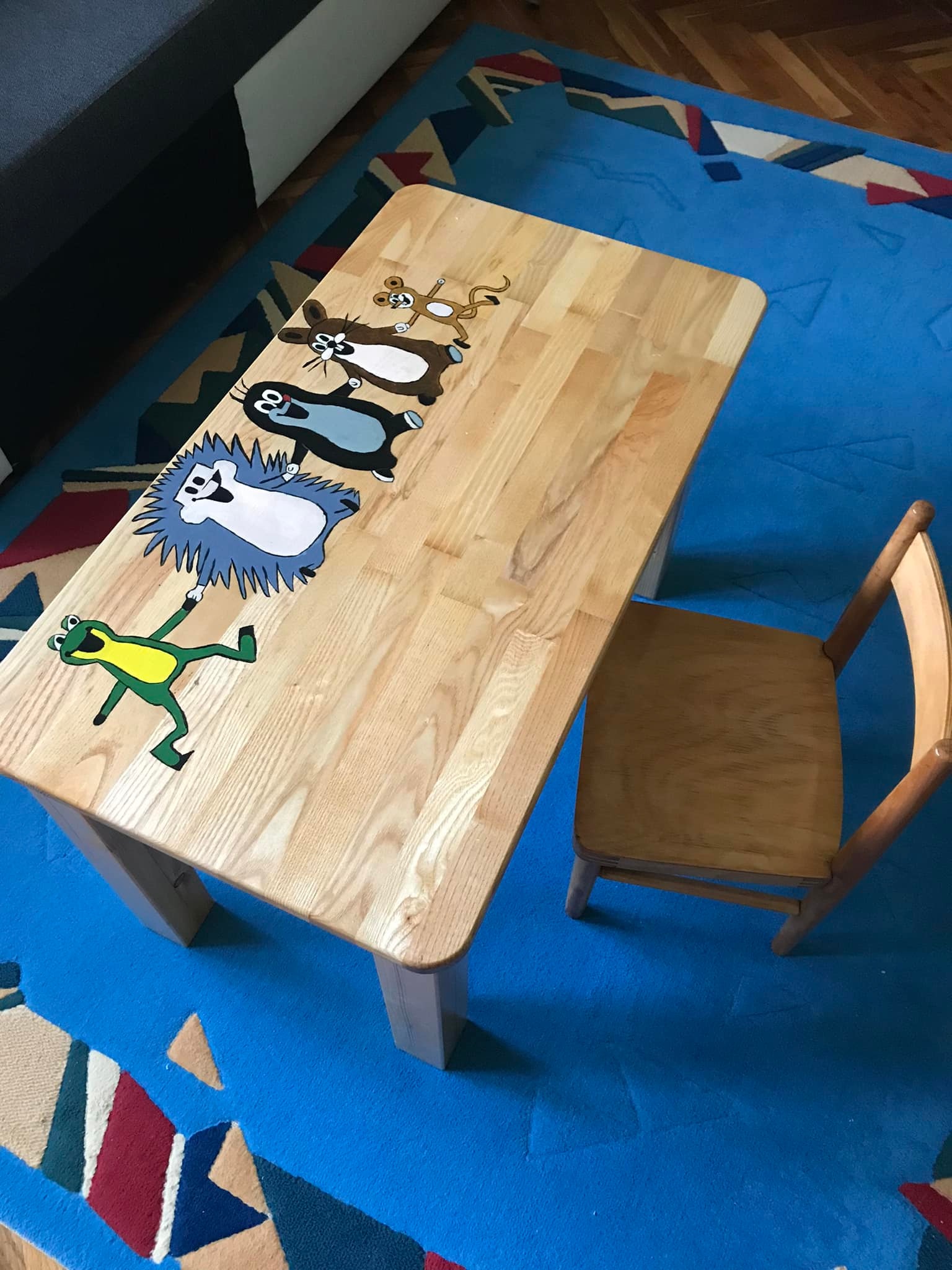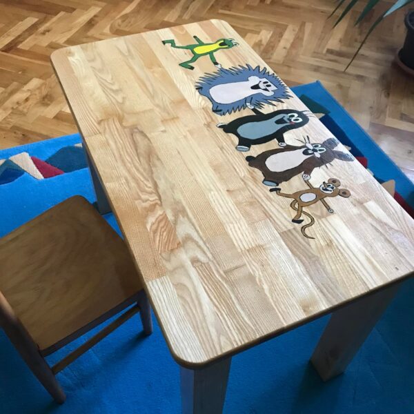 Na desce jsou ručně malované veselé postavičky zvířátek, což dělá stolek nejen praktickým, ale i zábavným doplňkem dětského pokoje. Povrchová úprava je provedena bezbarvým lakem, který chrání dřevo před poškozením a zároveň zachovává jeho přirozený vzhled. Tento stolek je ideální pro dětské tvoření, hraní i první školní úkoly.